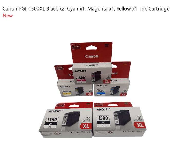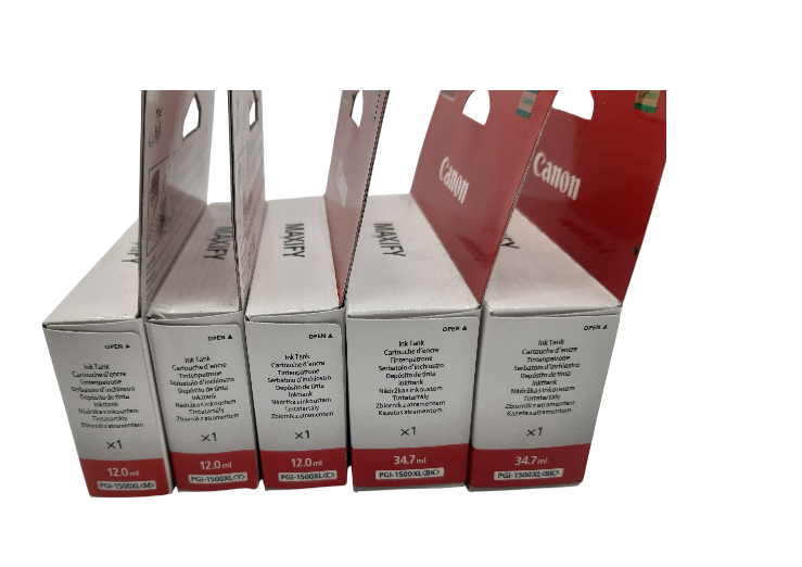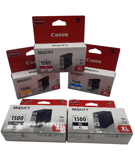 - Canon 1 x 12 ml PGI-1500 XL pigment yellow ink tank; 1 x 12 ml PGI-1500 XL pigment magenta ink tank; 1 x 12 ml PGI-1500 XL pigment cyan ink tank; 2 x 34.7 ml PGI-1500. Pigment black ink. Tank