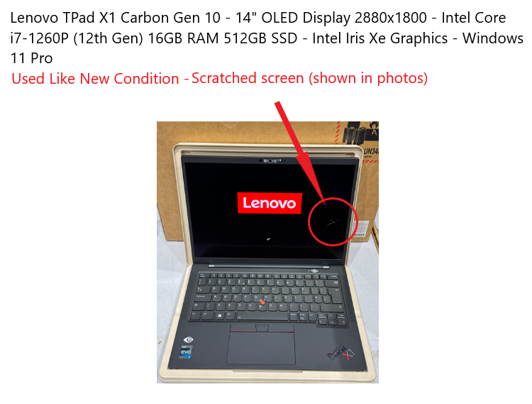 Laptop is in Used Like New Condition BUT has a scratched screen, right hand side (shown in pictures). It may have very, very slight signs of use. The original outer packaging will have some cosmetic damage. Sold with 90 day return to base warranty. VAT invoice provided.