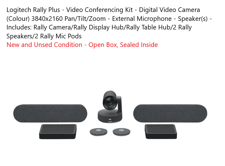 Kit Content Rally camera, Rally display hub, Rally table hub, 2 Rally speakers, 2 Rally Mic Pods