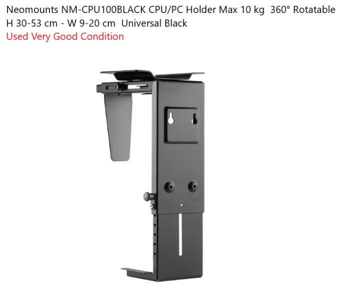 This Neomounts CPU mount allows vertical installation of computers under a desk. Also the NM-CPU100BLACK can be mounted on a wall. Hide your cables and keep the workplace nice and tidy.