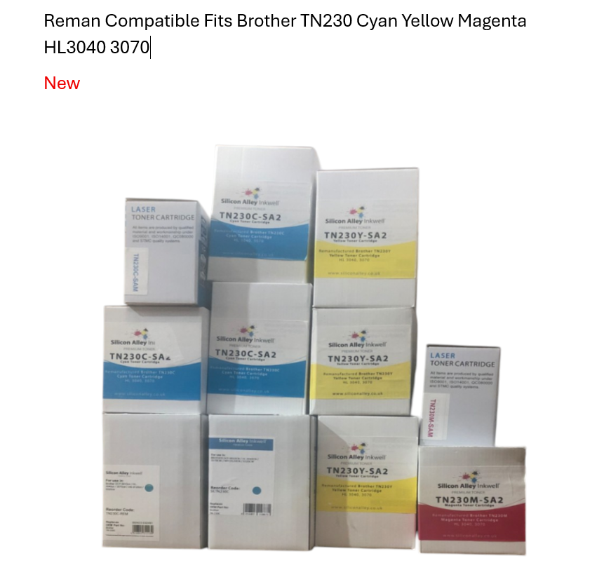 Reman Fits TN230 Cyan Magenta Yellow HL-3040CN 3070CW MFC-9010CN MFC-9120CN MFC-9320CW