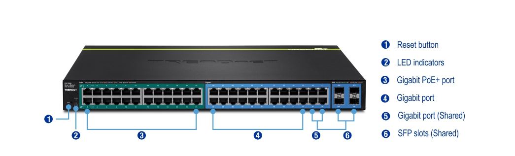 - 4 x shared SFP slots (shared with ports 45 – 48)